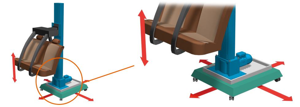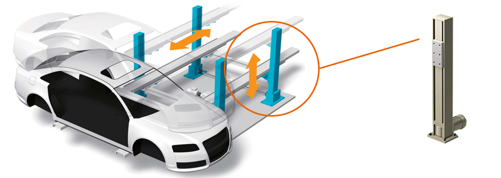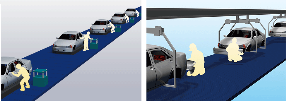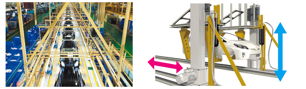 वाहन के ढांचे को बाईं और दाईं ओर दो लिफ्ट मास्टर सहायता से उठाने से काम सुचारू रूप से चलता है। इससे उत्पादन वाहन के ढांचे को बदलते समय उपकरणों को बार-बार बदलने की आवश्यकता भी कम हो जाती है।