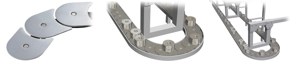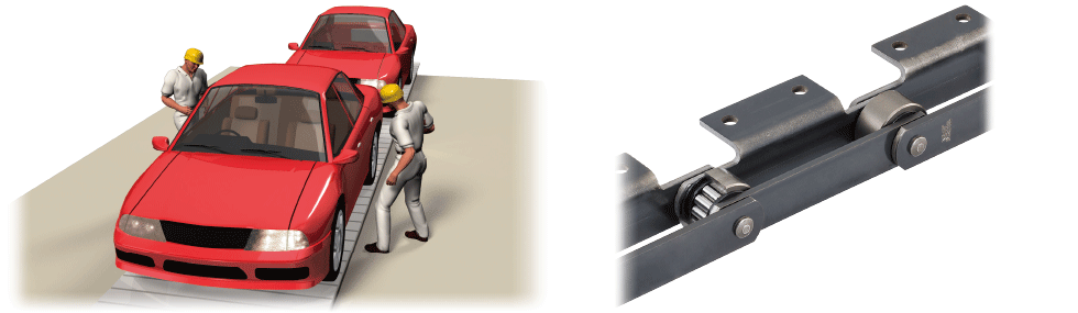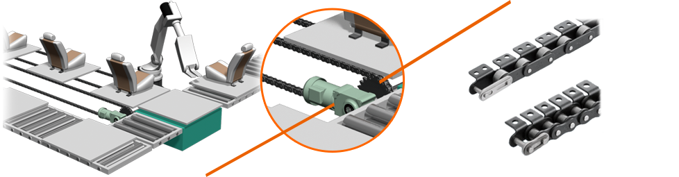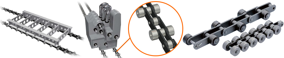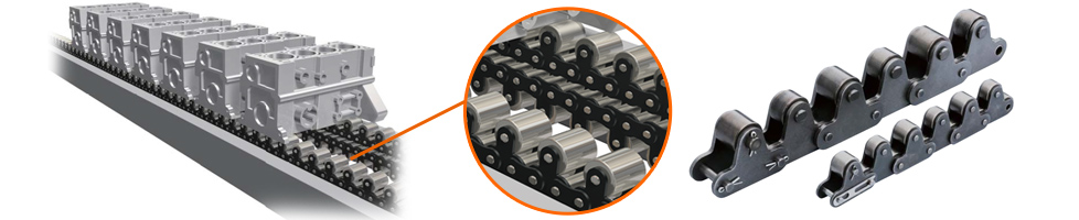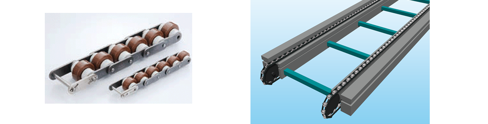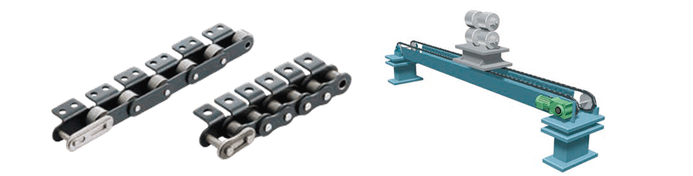 जिन उपकरणों में शीट और अन्य सामग्री को पैलेट पर लादकर असेंबली लाइनों तक पहुंचाया जाता है, वहां काफी मात्रा में सामग्री जमा हो जाती है, इसलिए डबल प्लस चेन और स्टील रोलर सीरीज का उपयोग किया जाता है। भारी वस्तुओं से लदे पैलेट को भी आसानी से ले जाया जा सकता है और पैलेट को होने वाली क्षति कम हो जाती है। जहां हल्की वस्तुओं का अधिक जमाव होता है प्लास्टिक रोलर सीरीज की सिफारिश की जाती है।