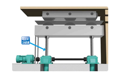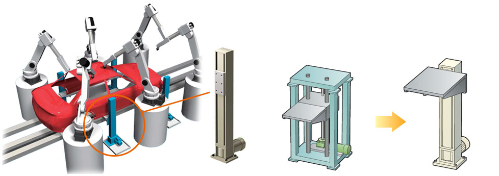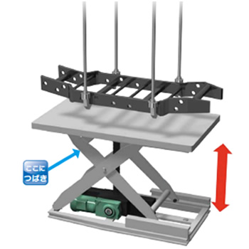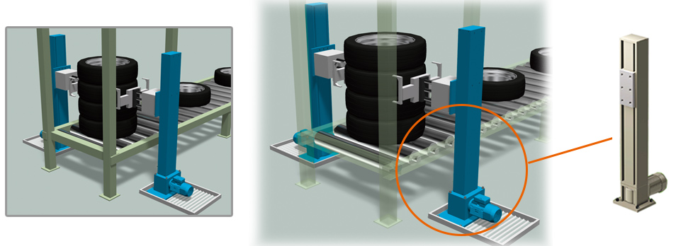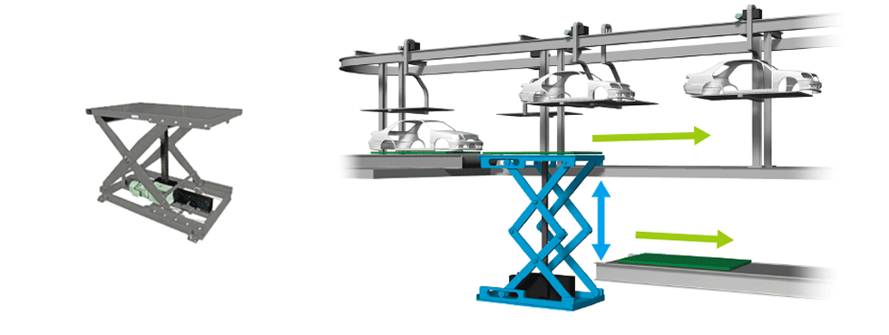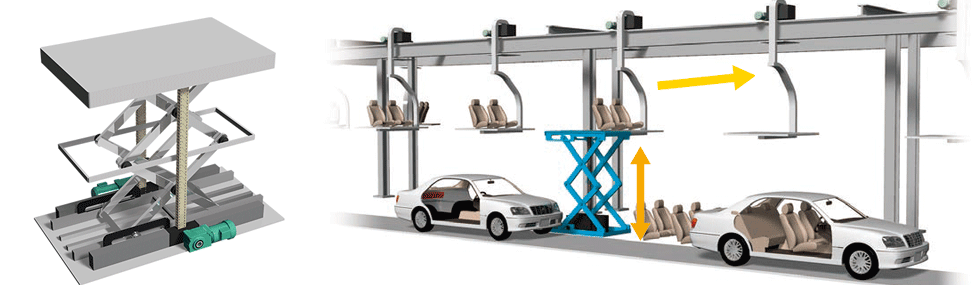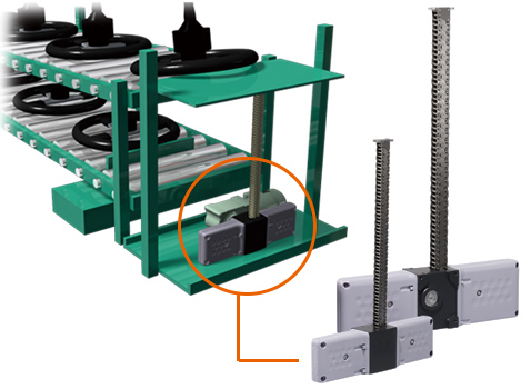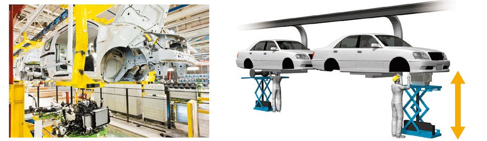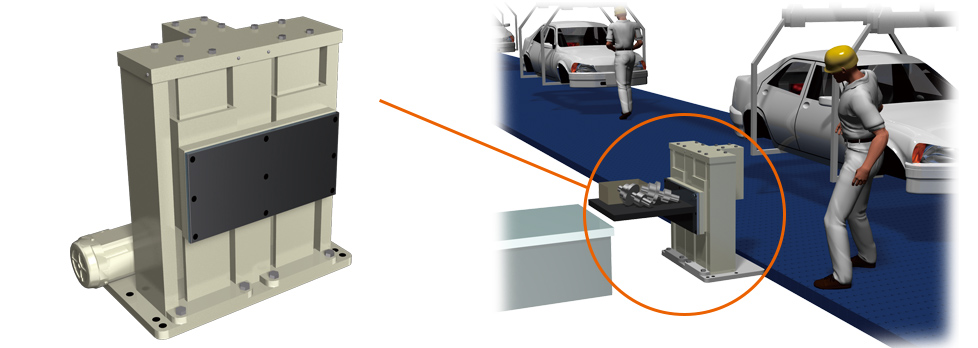 पुर्जों की प्रोसेसिंग और असेंबली लाइनों में, लिफ्ट मास्टर, जो एक तरफ से उठाने और नीचे करने में सक्षम है और आकार में कॉम्पैक्ट है, का उपयोग डिस्चार्ज और लोडिंग प्रवेश द्वारों पर उपकरणों को उठाने के लिए किया जाता है। इसे कम जगह में स्थापित किया जा सकता है, और ऊपर रिड्यूसर लगाने से रखरखाव आसान हो जाता है।