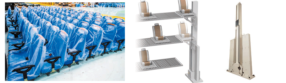 सीटों जैसे आंतरिक भागों को पैलेट पर लादकर असेंबली प्लांट में ले जाया जाता है। ज़िप मास्टर जिसे उच्च गति, उच्च आवृत्ति और उच्च परिशुद्धता के साथ ऊपर-नीचे किया जा सकता है, का उपयोग बहु-स्तरीय पोजिशनिंग उपकरण में इन भागों को रोलर कन्वेयर तक पहुंचाने के लिए किया जाता है, जो इन्हें असेंबली लाइन तक पहुंचाते हैं। यह ड्रॉप-एंड-पॉप प्रकार का उपकरण होने के कारण, इसे कम समय में स्थापित किया जा सकता है, जिससे साइट पर तेजी से सुधार कार्य किए जा सकते हैं।