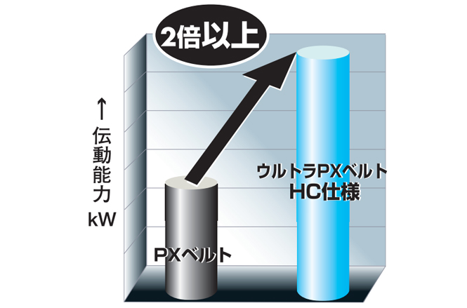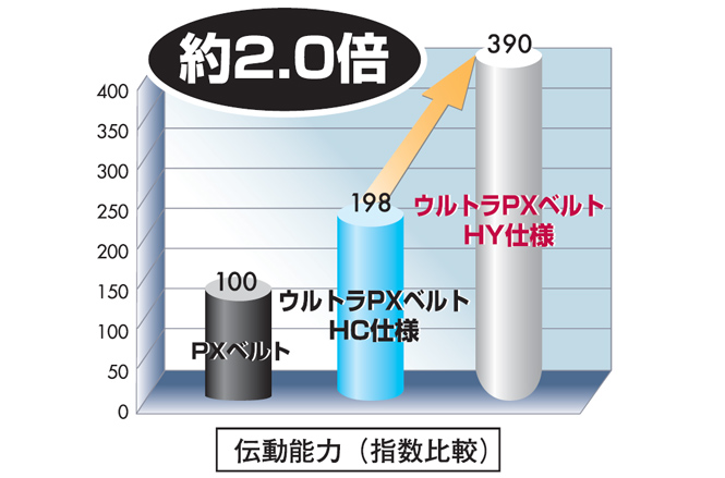 अल्ट्रा पीएक्स बेल्ट HY प्रकार एक ऐसी बेल्ट है जिसने कांच और कार्बन से बने हाइब्रिड कोर वायर के उपयोग से काफी अधिक मजबूती और कठोरता हासिल की है। इसने पारंपरिक HC प्रकार की तुलना में लगभग 1.3 से 2.0 गुना अधिक संचरण क्षमता प्राप्त की है। इससे उपकरण का आकार छोटा हो जाता है और यह अधिक कॉम्पैक्ट हो जाता है।