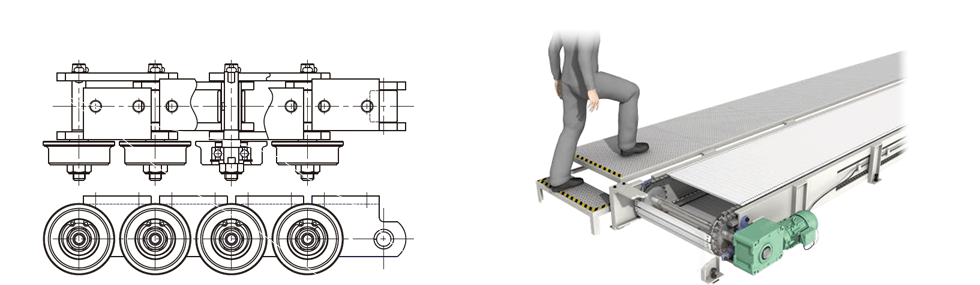 संचयी डबल प्लस चेन /स्टील रोलर श्रृंखला का उपयोग बॉडी ट्रांसपोर्ट पैलेट के परिवहन के लिए किया जाता है। साथ ही, पतले फ्रेम का उपयोग करके एक कॉम्पैक्ट ट्रांसपोर्ट कन्वेयर का निर्माण किया जा सकता है।