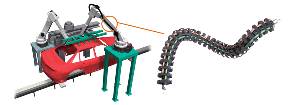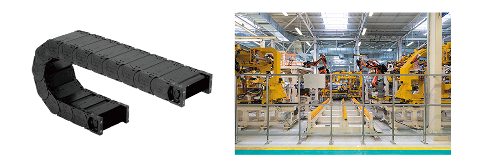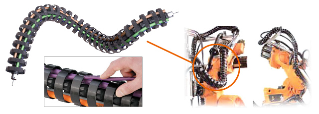 केबल कैरियर (CABLEVEYOR) प्लास्टिक श्रृंखला का उपयोग वेल्डिंग रोबोट के उन केबलों की सुरक्षा के लिए किया जाता है जो क्षेत्र में घूमते हैं।