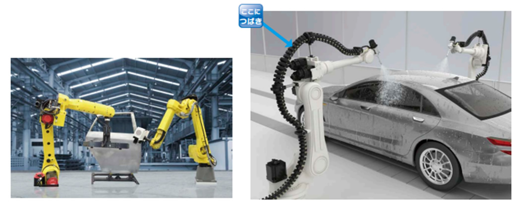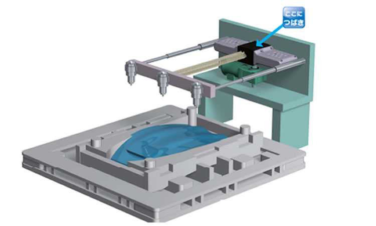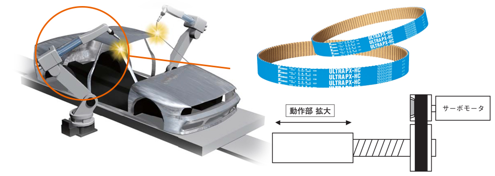 वेल्डिंग इलेक्ट्रोड को स्थानांतरित करने वाली गन के लिए एक स्वच्छ संचरण तंत्र की आवश्यकता होती है, इसलिए त्सुबाकी सिंक्रोनस बेल्ट्स अल्ट्रा पीएक्स बेल्ट HC प्रकार उपयोग किया जाता है, जो एक उच्च-शक्ति वाला, कॉम्पैक्ट संचरण उपकरण है जो ग्रीस या तेल नहीं फैलाता है।