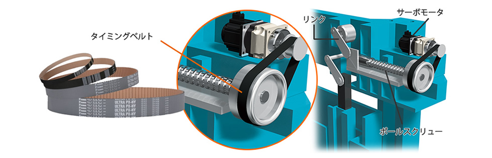त्सुबाकी सिंक्रोनस बेल्ट्स अल्ट्रा पीएक्स बेल्ट HC प्रकार, वेल्डिंग मशीनों के लिए ट्रांसमिशन डिवाइस के रूप में उपयोग किया जाता है।