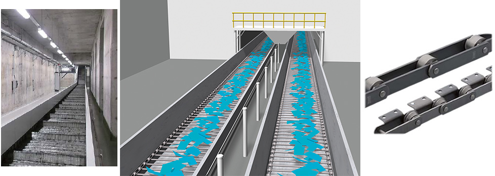 छोटे और बड़े व्यास वाले रोलर्स को मिलाकर बनाई गई एक अनूठी संरचना परिवहन की गति को 2.5 गुना तक बढ़ा देती है। चेन की गति को कम पर सेट किया जा सकता है, जिससे शांत तरीके से सामग्री का संचय हो पाता है।