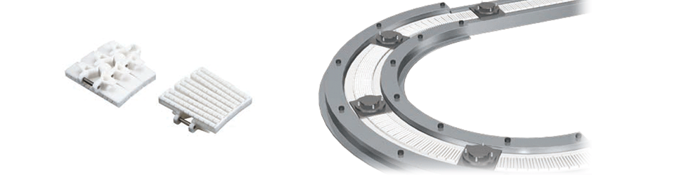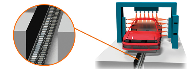 पुर्जों की प्रसंस्करण और निरीक्षण लाइनों पर, पुर्जों पर खरोंच लगने से बचाने के लिए कन्वेयर सतह में निर्मित रोलर्स वाली प्लास्टिक चेन और संचय चेन का उपयोग किया जाता है।