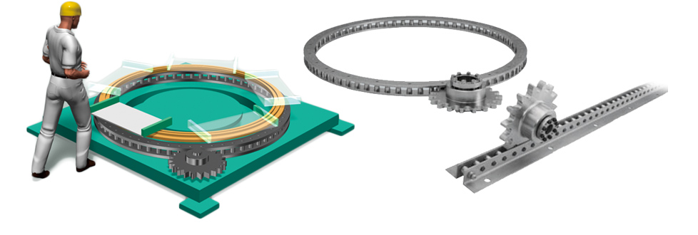 वेल्डिंग जिग्स के परिवहन के लिए घर्षण विधि के विकल्प के रूप में पिन गियर ड्राइव यूनिट उपयोग किया जाता है। पिन गियर द्वारा संचालित मेसिंग ड्राइव मशीनिंग तेल की उपस्थिति में भी विश्वसनीय परिवहन सुनिश्चित करता है, जिससे परिवहन चक्र का समय कम हो जाता है।