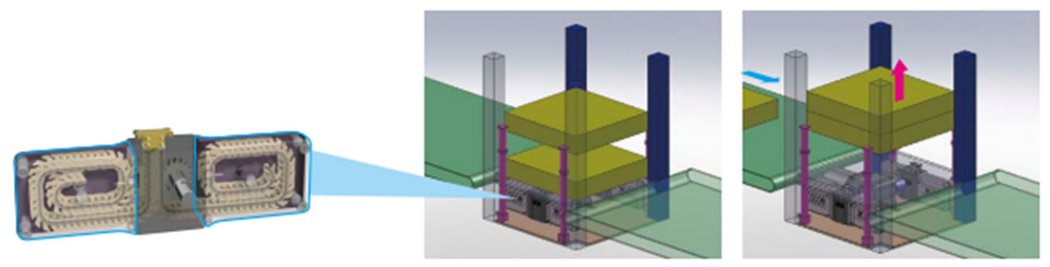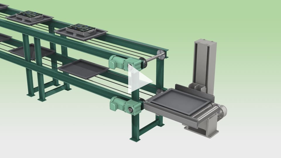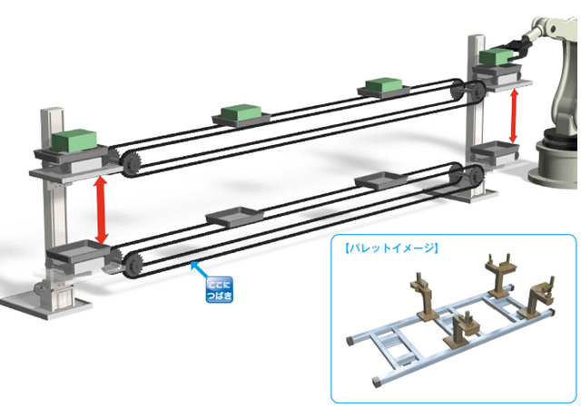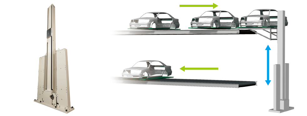 पैलेट पर लदे पिछले दरवाजों जैसे पुर्जों को उठाने के बाद, लिफ्ट मास्टर का उपयोग उन उपकरणों में किया जाता है जो खाली पैलेटों को नीचे स्थित रिकवरी कन्वेयर तक ऊपर और नीचे ले जाते हैं। इसे एक तरफ से ऊपर और नीचे किया जा सकता है और इसे कम जगह में भी स्थापित किया जा सकता है, जिससे जगह का प्रभावी उपयोग संभव होता है।