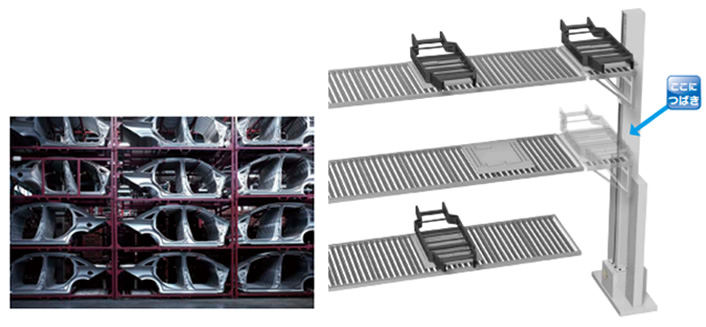 वाहन के ढांचे में असेंबल किए जाने वाले पुर्जों को प्रत्येक वाहन के लिए एक पैलेट पर रखा जाता है। लिफ्ट मास्टर का उपयोग लिफ्टर के रूप में किया जाता है ताकि असेंबली के लिए तैयार पैलेटों को एक साधारण स्टॉकर में रखा जा सके।