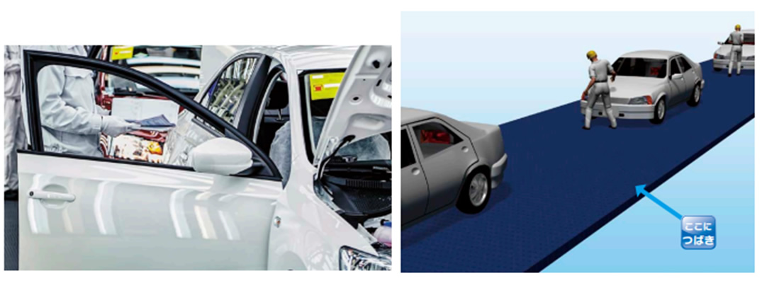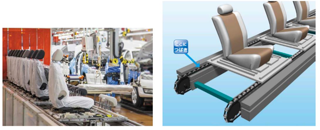 पुर्जों को सप्लाई कन्वेयर से असेंबली वर्कबेंच तक उठाया और उतारा जाता है, जहां श्रमिक उन्हें असेंबल करते हैं। इसमें त्सुबाकी के ज़िप चेन एक्ट्यूएटर उपयोग किया जाता है, जिसे श्रमिक की कमर की ऊंचाई तक की संकीर्ण जगहों में भी स्थापित किया जा सकता है।
