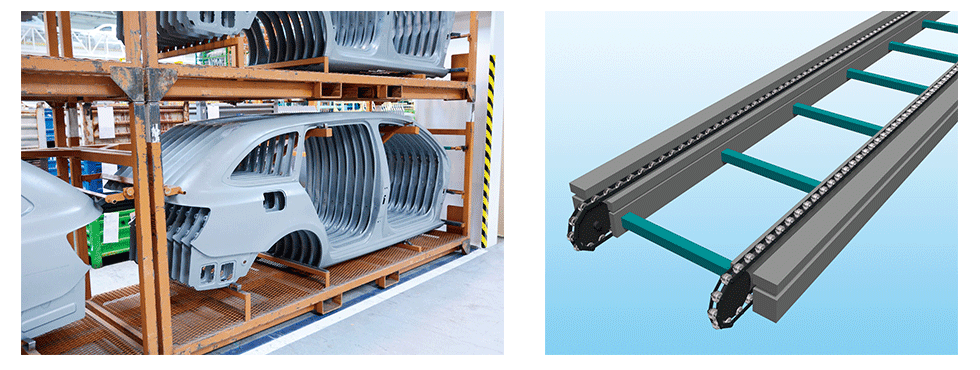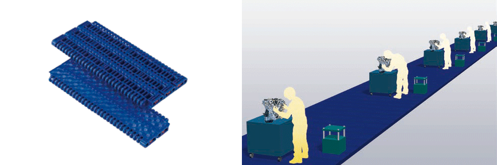कारखाने के रिसीविंग यार्ड में कार्ट में लदे ऑटो पार्ट्स को लाने-ले जाने वाले उपकरणों में प्लास्टिक मॉड्यूलर चेन का उपयोग करने वाले कन्वेयर का इस्तेमाल किया जाता है। कम ऊंचाई वाले, ड्रॉप-एंड-पंप कन्वेयर को गड्ढा खोदे बिना स्थापित किया जा सकता है, जिससे कम समय में उपकरणों को अपग्रेड करना संभव हो जाता है।