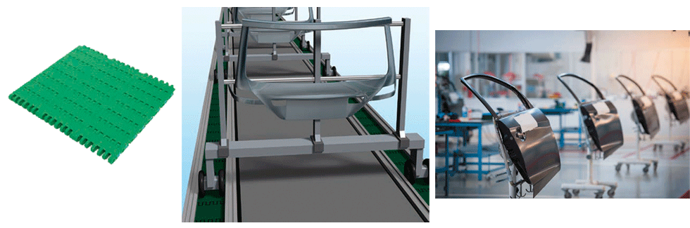 अंतिम निरीक्षण प्रक्रिया के दौरान निरीक्षकों और वाहनों को एक साथ ले जाने वाले कन्वेयर पर प्लास्टिक मॉड्यूलर चेन उपयोग किया जाता है। प्लास्टिक प्लास्टिक मॉड्यूलर चेन का रखरखाव आसान होता है क्योंकि इसके पुर्जों की मरम्मत की जा सकती है।