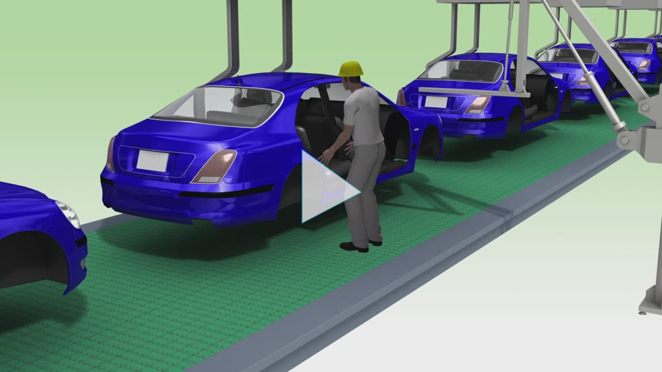 पुर्जों की प्रोसेसिंग और असेंबली लाइनों पर, लटके हुए पुर्जों और गाड़ियों पर लदे इंजनों को ले जाने वाले कन्वेयरों के संचालन को श्रमिकों और टूल कार्ट को ले जाने वाले कन्वेयरों के साथ सिंक्रनाइज़ करके कार्य कुशलता में सुधार किया जाता है।