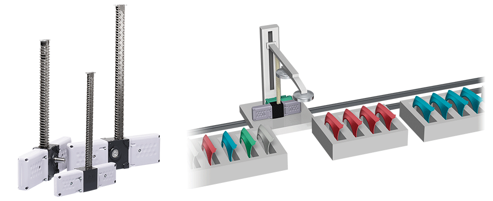 लिफ्ट मास्टर और पिन गियर ड्राइव यूनिट को संयोजित करने वाला एक मॉड्यूल उन उपकरणों में उपयोग किया जाता है जो रियर सस्पेंशन जैसे भारी पुर्जों को घुमाते हैं और उन्हें कन्वेयर के बीच स्थानांतरित करते हैं पिन गियर ड्राइव यूनिट का उपयोग करने वाली घूर्णनशील प्लेट पर लिफ्ट मास्टर स्थापित करके, जिसे रखा और गिराया जा सकता है, कम जगह में सुचारू घूर्णन और स्थानांतरण प्राप्त किया जा सकता है।