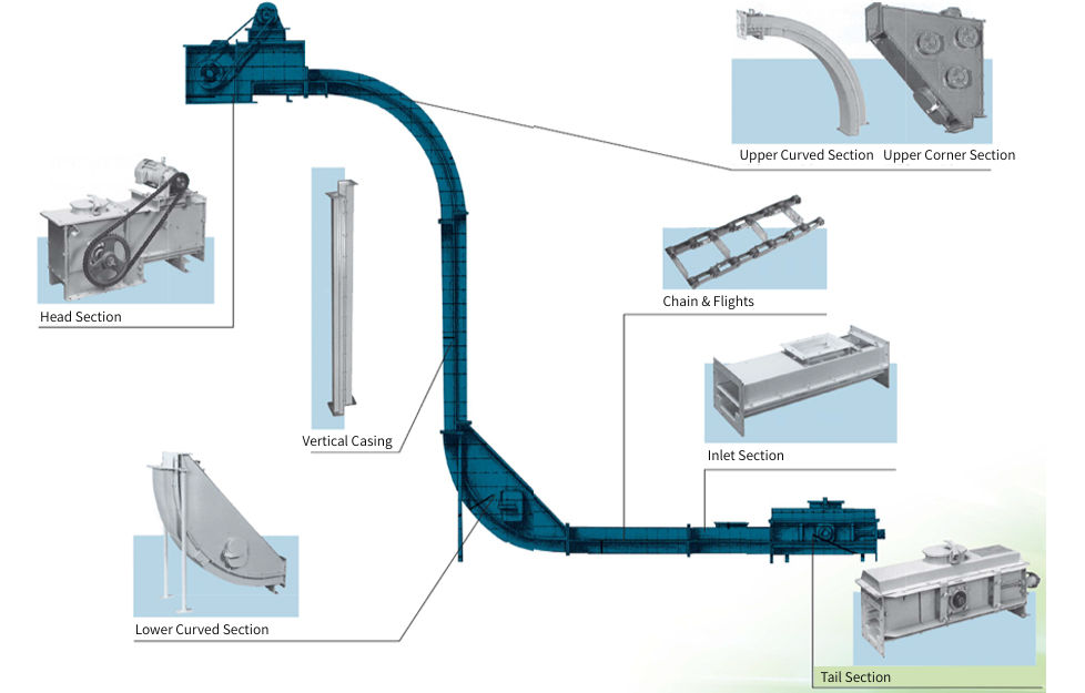 सीलबंद केस के अंदर दो जंजीरों पर लगे ये लिफ्ट, क्षैतिज भाग में फ्लो कन्वेयर और ऊर्ध्वाधर भाग में बकेट एलिवेटर के सिद्धांतों का उपयोग करके सामान को विश्वसनीय रूप से परिवहन करते हैं।