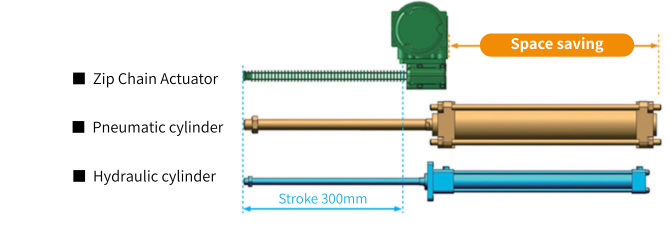 ज़िप चेन एक्ट्यूएटर मदद से ज़िप चेन मुख्य बॉडी के अंदर कॉम्पैक्ट रूप से स्टोर किया जा सकता है, जिसके परिणामस्वरूप इसका आकार पारंपरिक लिनियर एक्ट्यूएटर के आकार का 1/4 से 1/5 रह जाता है।