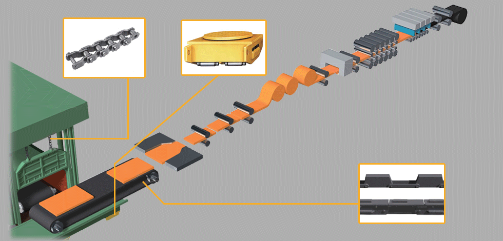 CAL और CGL सहित स्टील शीट सतह उपचार लाइनों में, निरंतर सतह उपचार किया जाता है। इसमें इनपुट सिरे पर कॉइलों के बीच के जोड़ों को वेल्डिंग करना और आउटपुट सिरे पर वाइंडिंग के बाद कॉइलों को काटना शामिल है। जब प्रवाह बाधित होता है, तो संग्रहित स्टील शीटों को सुचारू रूप से पहुंचाने के लिए लूप टॉवर के कैरिज को ऊपर और नीचे किया जाता है। विश्वसनीय और सिद्ध हेवी-ड्यूटी ड्राइव चेन कैरिज को ऊपर और नीचे करने में महत्वपूर्ण भूमिका निभाती है।