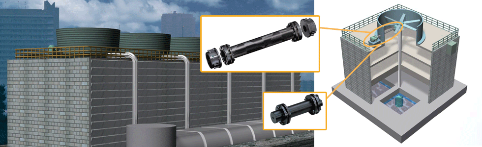 बड़े पंखे के व्यास वाले कूलिंग टावरों के लिए, पंखे को चलाने वाली मोटर और गियरबॉक्स के बीच एक लंबे स्पेसर प्रकार का एचटी-फ्लेक्स कपलिंग आदर्श होता है।