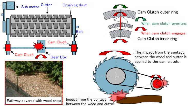 जब लकड़ी और कटर संपर्क में आते हैं, तो एक प्रभाव उत्पन्न होता है, और कैम, कैम क्लच के आंतरिक रेस से जुड़ जाता है।