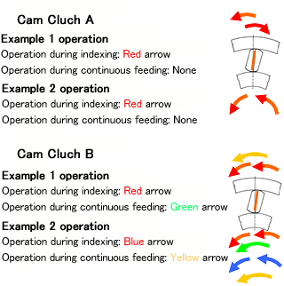 उदाहरण 2 में, कैम क्लच A इंडेक्सिंग के लिए है और कैम क्लच B ओवररनिंग के लिए है।