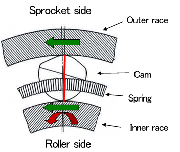| * ■ अनुभाग में, सभी रोलर्स पर कैम क्लच लगाए जाते हैं और चेन को ज़िगज़ैग पैटर्न में लपेटा जाता है। कैम क्लच बाहरी रेस से एक स्प्रोकेट जुड़ा होता है, तथा आंतरिक रेस एक रोलर से जुड़ी होती है। |