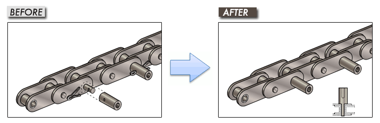 एक्सटेंशन पिनों की अतिरिक्त मशीनिंग और अटैचमेंट जोड़ने पर, पिन विकृत और टूट रहे थे, जिससे चेन का जीवनकाल कम हो रहा था। सुधार के अनुरोधों के जवाब में, हमने एक विशेष स्टेप्ड एक्सटेंशन पिन का प्रस्ताव रखा।