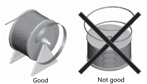 रील वाले केबल को सर्पिल आकार में न खींचें। रील को लंबवत रूप से लगाने के लिए शाफ्ट या इसी तरह के किसी उपकरण का उपयोग करें, और केबल को इस तरह खींचें कि वह मुड़े नहीं।