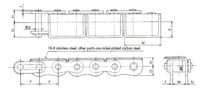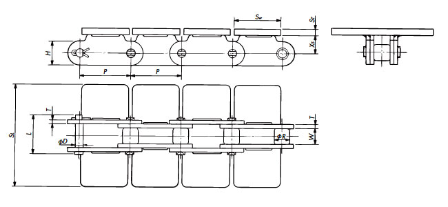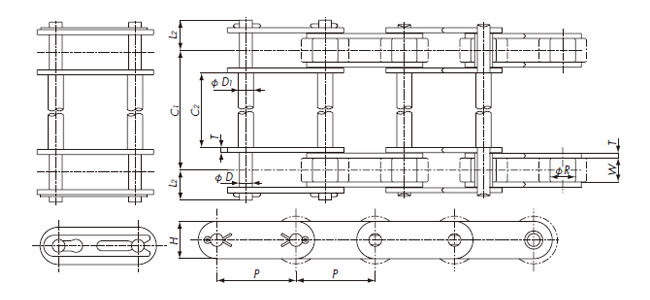 DL | इस डबल पिच चेन का H1 आयाम रोलर्स की ऊपरी सतह से बड़ा है। R रोलर्स के साथ भी, संप्रेषित वस्तुओं को सीधे इस पर रखा जा सकता है।![]() |