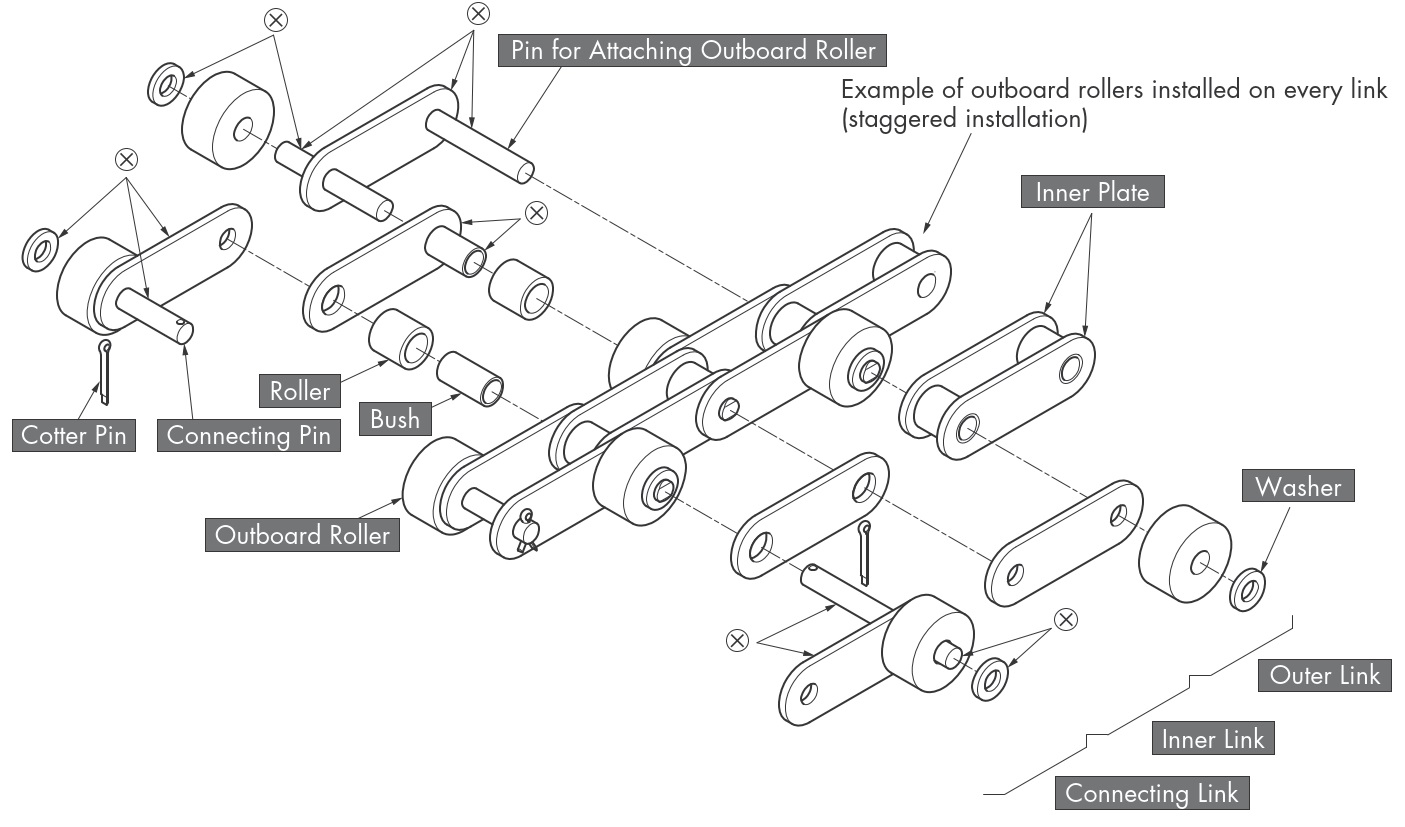 - आउटबोर्ड रोलर्स के साथ डबल पिच चेन फ्री-फ्लो चेन होती हैं जिनमें डबल पिच के पिन विस्तारित होते हैं और उन पर फ्री-रोटेटिंग बाहरी रोलर लगे होते हैं।
