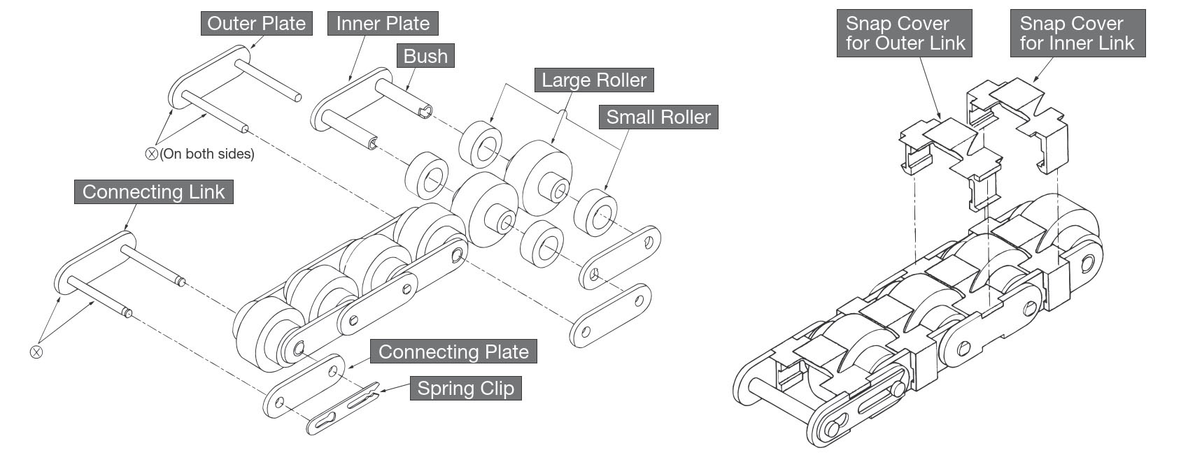 मानक श्रृंखला चेन बॉडी स्टील से बनी होती है, और रोलर्स (7 प्रकार के) को आवश्यकतानुसार संयोजित किया जा सकता है। (VRPUA और VRPUB केवल RF2030 में उपलब्ध हैं।) - ・लैम्ब्डा विनिर्देश (स्नैप कवर के बिना / स्नैप कवर के साथ)