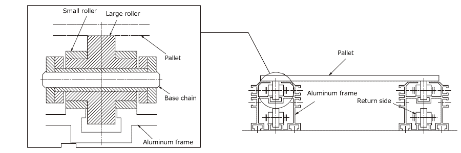 बड़े व्यास वाला रोलर और छोटे व्यास वाला रोलर (● से चिह्नित) उनके बीच फिसलते हैं, जिसके परिणामस्वरूप मुक्त प्रवाह होता है।