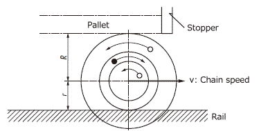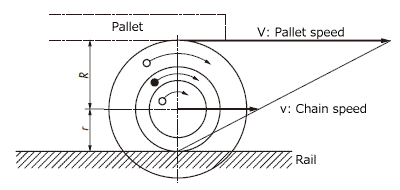 जब चेन ν गति से चलती है, तो छोटे व्यास वाले रोलर्स की परिधीय गति (रेल चलने वाली सतह की रोलिंग गति) ν होती है।