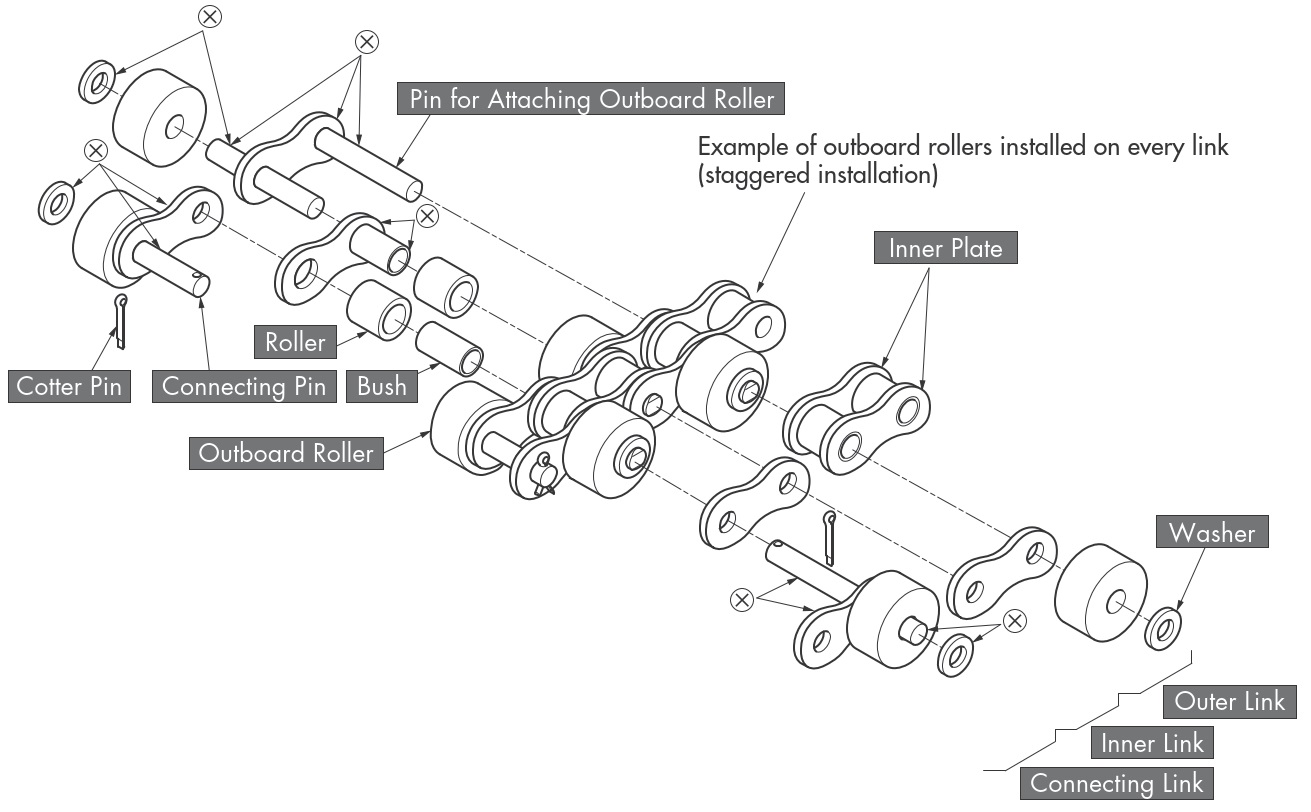 जब तक अन्यथा निर्दिष्ट न किया जाए, बाहरी रोलर वाली चेन 1 यूनिट (1 चेन लंबाई) की इकाइयों में वितरित की जाएंगी।