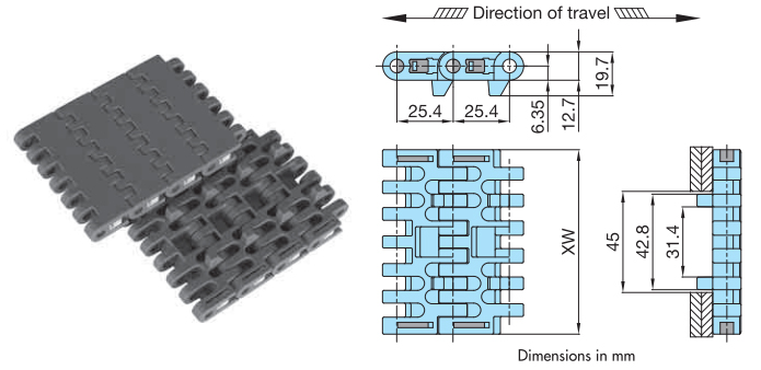 • - चेन की पिच = 25.4 मिमी, मध्यम आकार के कंटेनरों के परिवहन के लिए आदर्श।