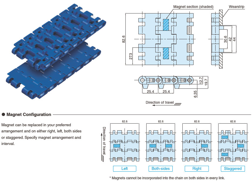 • - कम चुंबकीय बल (BTM8H प्रकार के चुंबकीय बल का लगभग 60%) परिवहन की जाने वाली वस्तु के चेन से अलग होने पर प्रभाव को कम करता है, जिससे परिवहन की जाने वाली वस्तु और चेन दोनों को होने वाली क्षति कम हो जाती है।