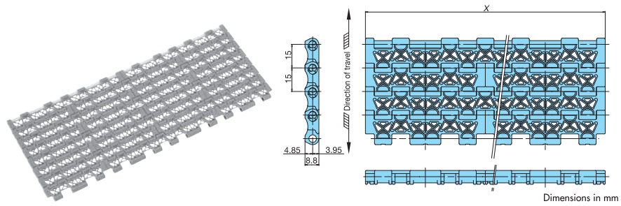 • ・幅広と幅狭のプラスチック製モジュールをレンガ状に組合せ、ワイドな搬送面を実現し大量搬送が可能です。