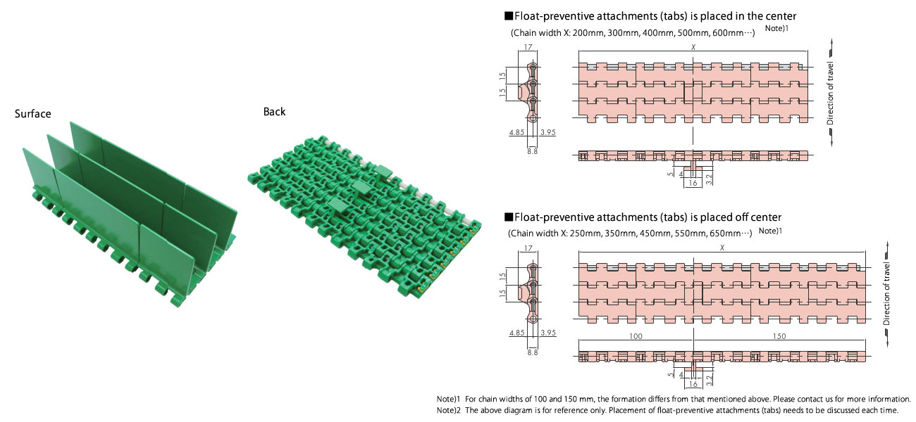 プラスチックモジュラーチェーンWT1515T-F-W形 主要諸元