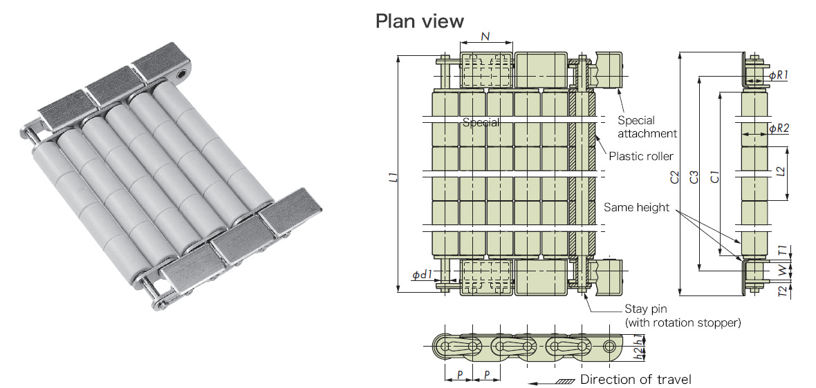 - विशेष अटैचमेंट और प्लास्टिक रोलर की ऊपरी सतह एक ही ऊंचाई पर हैं, जिसका मतलब है कि जब दो समानांतर पंक्तियाँ स्थापित की जाती हैं तो चेन की एक पंक्ति से दूसरी पंक्ति में जाना आसान होता है।