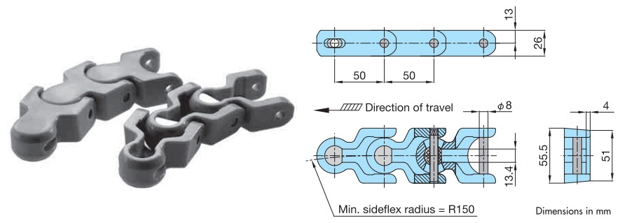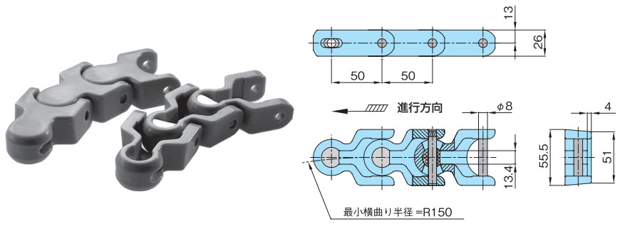 • ・小さな横曲がり半径(R=150)。自由なレイアウトが可能で、狭いスペースでの搬送に最適です。