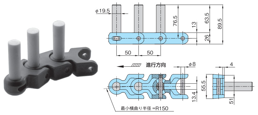 • ・小さな横曲がり半径(R=150)。自由なレイアウトが可能で、狭いスペースでの搬送に最適です。