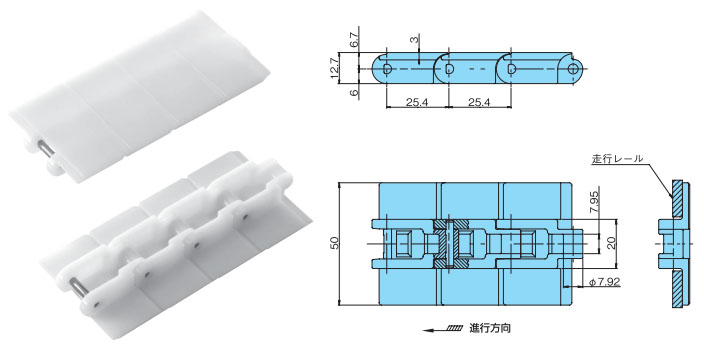• ・プレート幅50mmでチェーンピッチ25.4mmの小形搬送用チェーン。小物の搬送に適します。