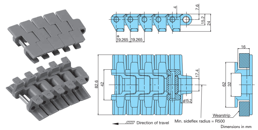 • - लिफ्ट-अप रोकथाम अटैचमेंट वाली चेन। यह कोनों पर और ऊपर-नीचे जाने वाले कन्वेयर पर लिफ्ट-अप को रोकती है, साथ ही वापसी की तरफ प्लेट की ऊपरी सतह को होने वाले नुकसान से भी बचाती है।