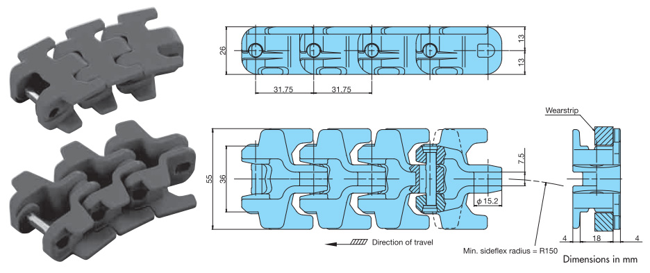 • ・小さな横曲がり半径(R=150)。自由なレイアウトが可能で、狭いスペースでの搬送に最適です。