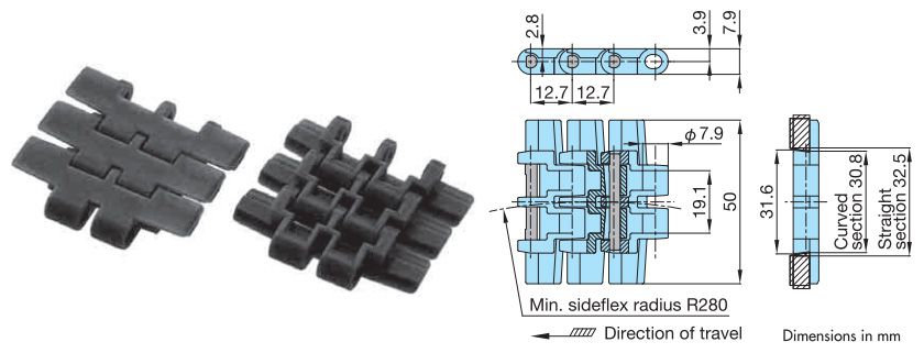 • ・チェーンピッチ12.7mmを採用。コンベヤの低騒音化や乗継部の省スペース化に有効です。