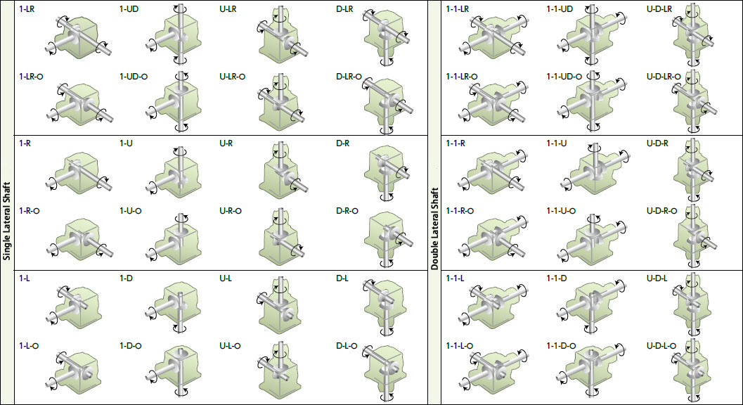・नीचे दी गई शाफ्ट व्यवस्थाओं में समान घूर्णन संबंध है। हालाँकि, कृपया ध्यान दें कि प्लग, तेल गेज और नेमप्लेट की स्थितियाँ अलग-अलग हैं।