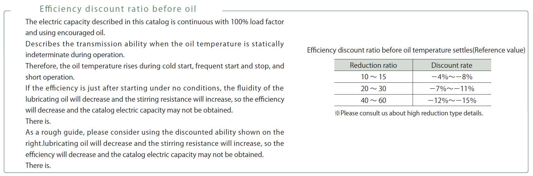 वर्म रिड्यूसर की दक्षता, रिडक्शन अनुपात और इनपुट शाफ्ट (मोटर) की घूर्णन गति के आधार पर भिन्न होती है। उदाहरण के लिए, जब EW100T10R (आकार 100, कमी अनुपात 1/10) को 1,750 r/min पर इनपुट किया जाता है, तो परिचालन दक्षता 90% से अधिक होती है, और जब इसे 100 r/min पर इनपुट किया जाता है, तो परिचालन दक्षता लगभग 80% होती है। इनकी गणना कैटलॉग में किलोवाट रेटिंग तालिका से की जा सकती है। |