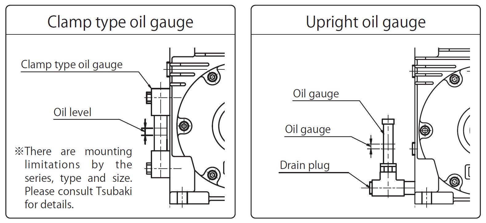 मानक तेल गेज लाल-वृत्त प्रकार का होता है, जिससे सामने से तेल के स्तर की जांच करना आसान हो जाता है, लेकिन क्लैंप-प्रकार और ऊर्ध्वाधर तेल गेज भी विकल्प के रूप में उपलब्ध हैं, जिससे बगल से तेल के स्तर की जांच करना आसान हो जाता है। क्लैंप-प्रकार के तेल गेज को एक सहायक उपकरण के रूप में भेजा जाता है, क्योंकि शिपिंग या परिवहन के दौरान इसके क्षतिग्रस्त होने का खतरा रहता है। इस मामले में, तेल को बहने से रोकने के लिए एक अंधा प्लग स्थापित किया जाता है, इसलिए कृपया उपयोग से पहले इसे बदल दें। |